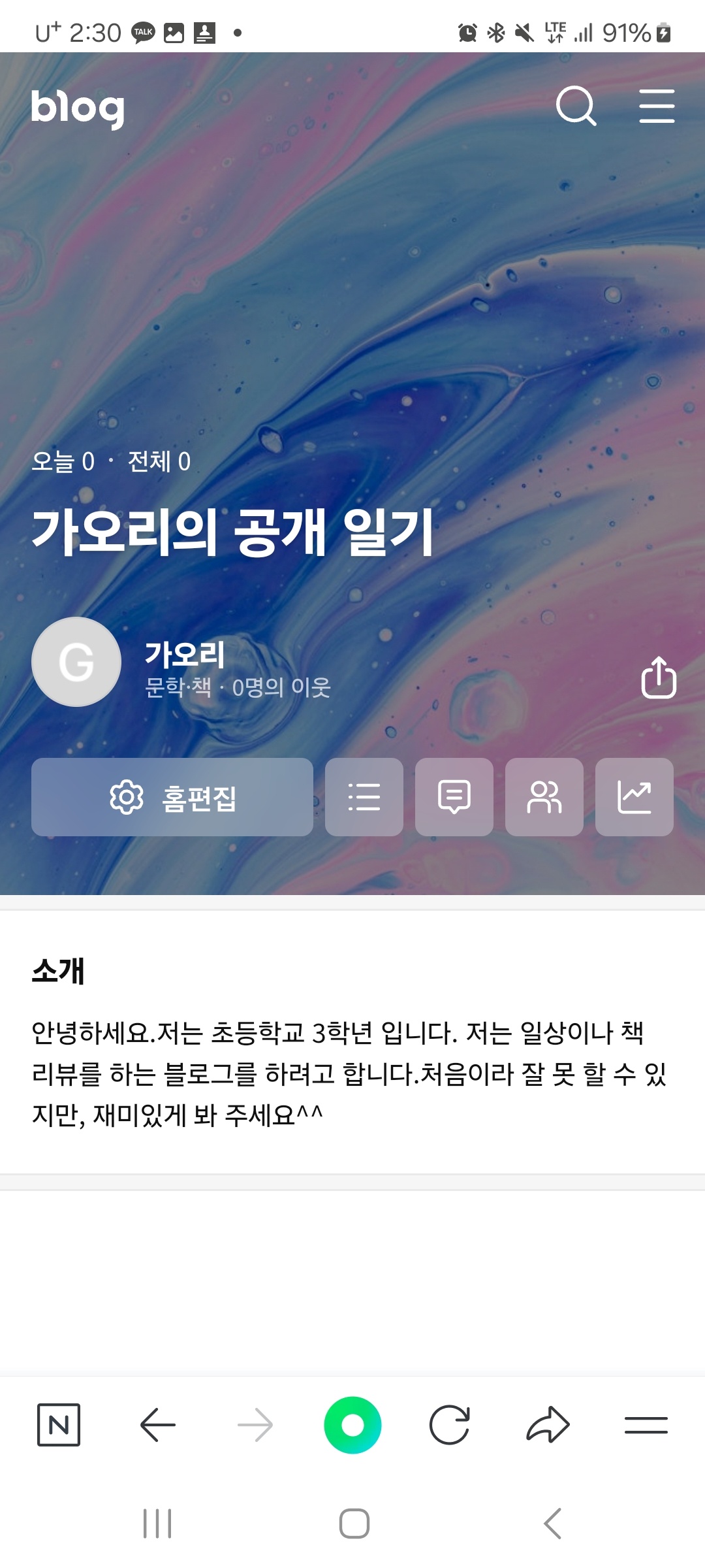 저희 아이는 꼼꼼하고 완벽주의 성격이라 아직 발행을 1건도 하지 못했습니다ㅎㅎ 어른들이 쓴 블로그를 보면서 아이 스스로 잘 써야 한다는 부담감이 생겼는지 임시 저장만 하고 수정 또 수정하고 있습니다. 저는 결과보다는 그런 시행착오의 과정들을 거치면서 아이가 스스로 깨달고 배우는 과정이  더 중요하다고 생각하여 어떤 코멘트도 하지 않고 있습니다. 글을 쓰다가 저의 핸드폰을 빌려 아이가 중요하다고 생각되는 책의 페이지를 사진으로 찍기도 하고, 같은 책을 쓴 다른 블로그의 글을 읽기도 합니다. 그렇게 들어간 책리뷰 블로그의 다른 글들도 읽으면서 책 리뷰는 어떻게 쓰는지에 대해 조금씩 알아가고 있습니다.  겨울 방학과 동시에 블로그를 개설 해 준 건 정말 탁월한 선택이었다고 생각합니다. 방학동안 시간적 여유가 많으니 학기 중보다 유튜브 컨텐츠를 접할 시간 또한 많아졌을텐데 아이 스스로 글 쓰는 재미에 빠져 유튜브 시청을 하지 않고 있습니다. 기성 세대와 다르게 요즘 아이들의 교육은 미디어 교육이 이제는 피 할 수 없다고 생각합니다. 무조건 안된다고 하기 보다는 방대한 미디어 정보 속에서 올바른 정보를 고르고  스스로 판단과 선택을 할 수 있게 길라잡이를 해 주는 것이 우리 부모의 과제라고 생각합니다.