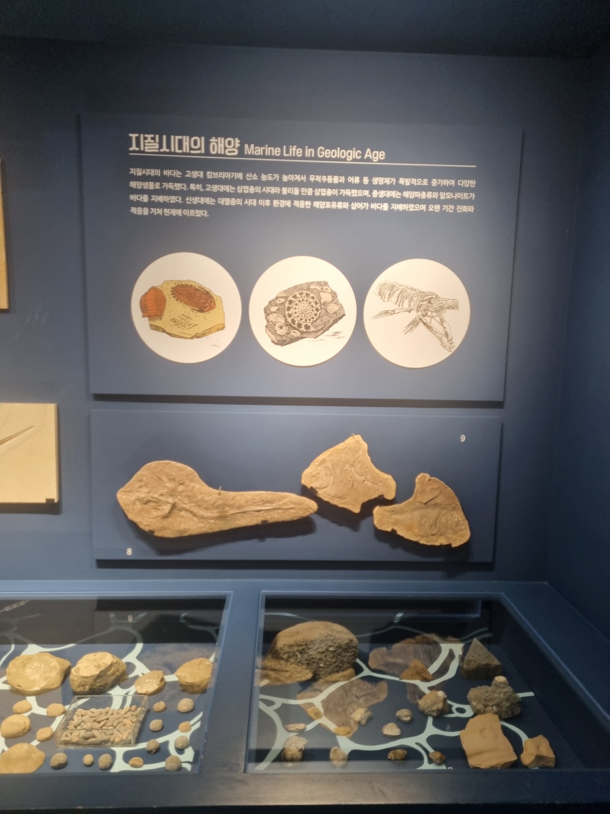 둘째는 겁이 많아 손도 못 넣었지만, 첫째는 손을 놓고 물고기와 놀면서 다른 장소로 이동할 생각이 없습니다. 아이를 설득하여 전시실로 들어오니 다양한 화석들이 전시되어 있습니다. 공룡시대부터 자헤시 설명되어 있어 설명들을 하나하나 자세히 본다면 2층에서만 몇시간을 보낼 수 있을것 같습니다.