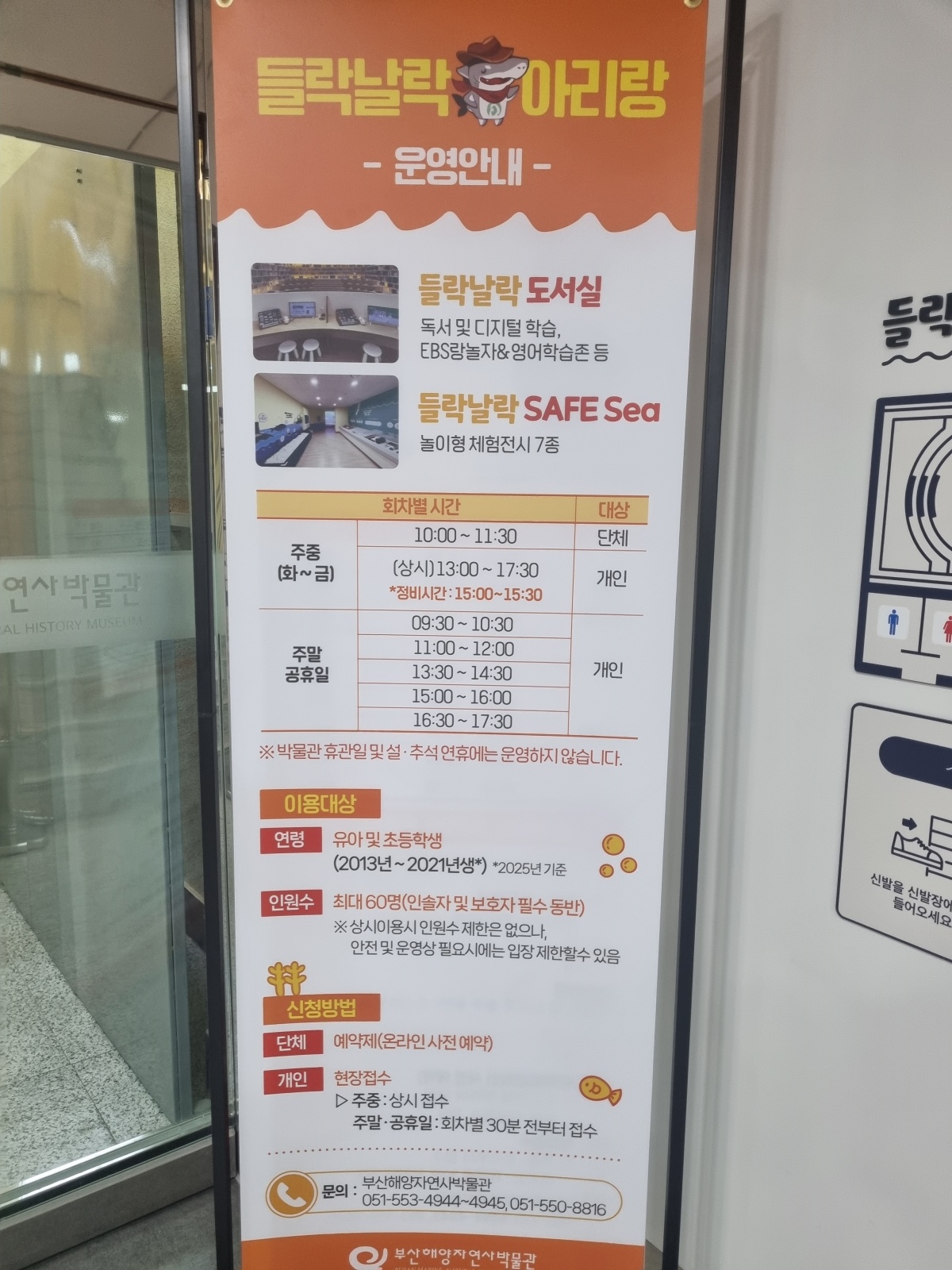 관람 시작 시간은 오전 9시부터 입니다. 관람 소요 시간은 2관 리모델링으로 인해 참여 할 수 있는 활동이 많이 생겨서 아이들과 모든 체험을 다 하시면 충분히 3시간은 소요 가능합니다. 저희는 설날 연휴에 방문하여 들락 날락 아리랑이랑 용궁 탐험대가 미운영이라 참여하지 못했지만, 그래도 2시간 30분을 소요하였습니다. 어린 아이가 있는 가족은 2관 2층에 아기 쉼터가 마련되어 있어 편안하게 모유수유가 가능합니다.
