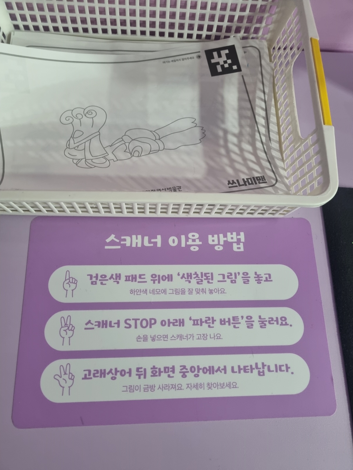 1관은 4층이 메인 층이라면, 2관은 2층이 메인 층이라고 할 수 있는데요, 먼저 색칠하기는 아이들에게 제일 인기이지요. 색칠을 마무리하고 스캐너에 넣으면 큰 화면에 아이가 색칠한 그림이 살아 움직이는 것을 볼 수 있어 너무 즐거워 했습니다.