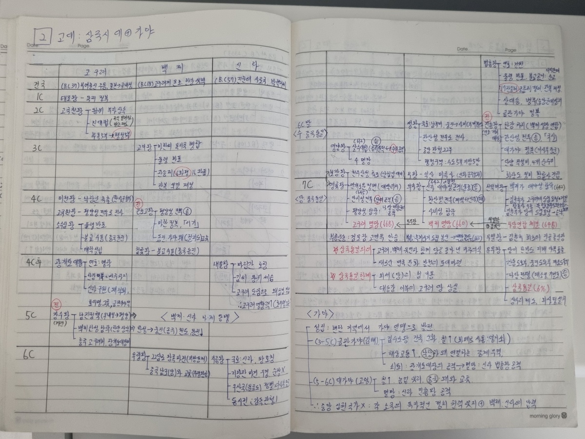 필기 기본 색은 파란색 볼펜으로 합니다. 검은색 볼펜보다 진정효과가 있고 가독성이 더 좋습니다. 중요 키워드 단어는 당연히 빨간 볼펜을 사용해야 합니다. 필기 내용을 한문장 한문장으로 기억하는 것이 아니라, 한 페이지를 하나의 그림으로 인식하여 통째로 외우는 것이 중요합니다. 어떤 시험이든지 목차의 순서대로 시험이 출제되기 때문에 노트를 펼쳐서 2페이지에 한 단원을 다 정리하는 것이 중요합니다. 그럴러면 레이아웃부터 시작하여 2페이지에 내용이 다 담길 수 있도록 전략을 짜는 시간이 필요합니다. 그 시간이 아깝지 않을만큼 큰 효과가 있으니 꼭 한번 해 보시면 좋겠습니다.