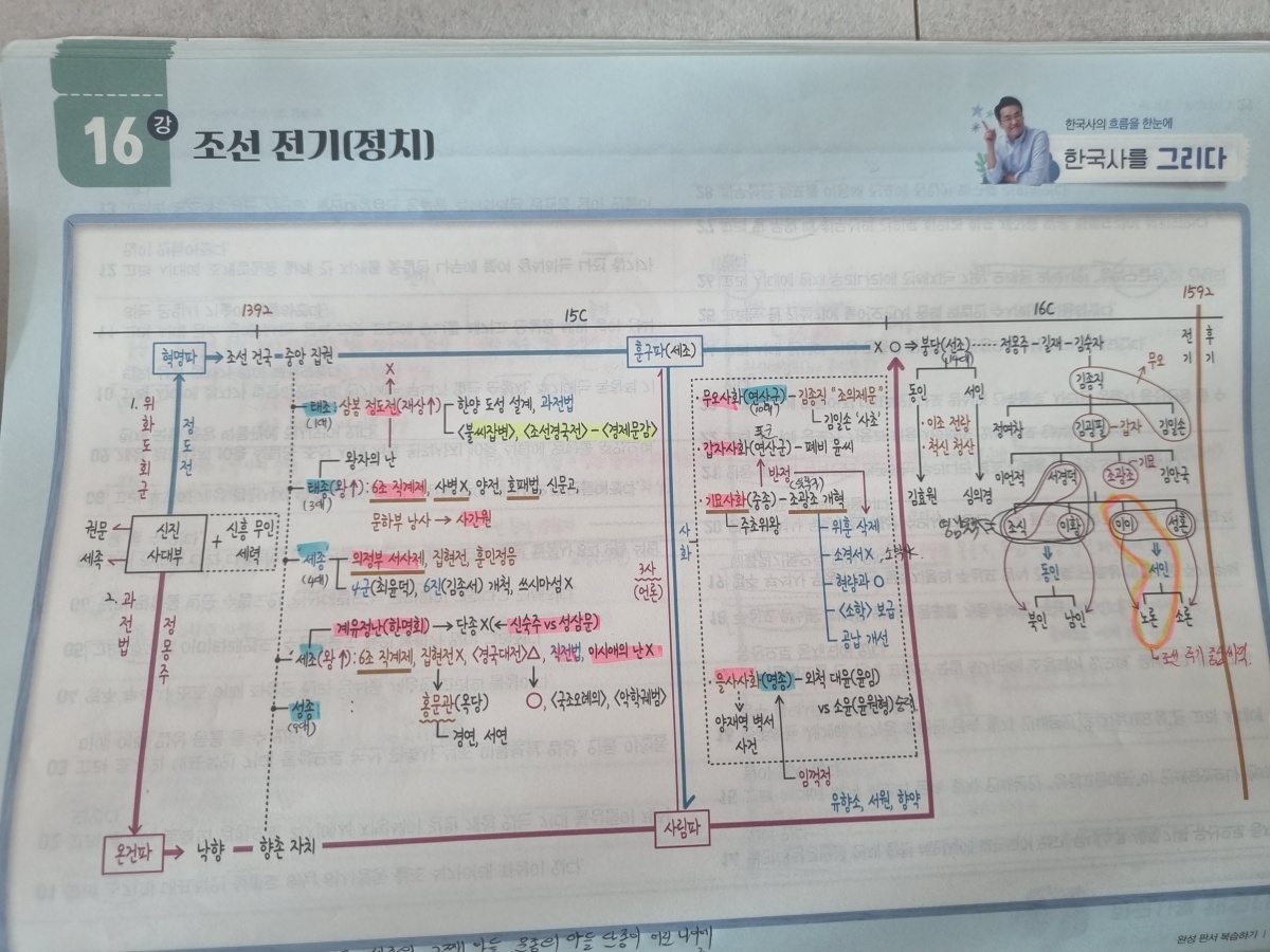 저는 고대부터 현대까지 크게 7단원으로 나눠 1단원을 하나의 그림으로 인식하고 외웠습니다. 예를 들어, "강화도 조약" 이라는 키워드가 어느 페이지 어떤 박스에 들어있었는지만 기억해도, 시대 구분이 가능합니다