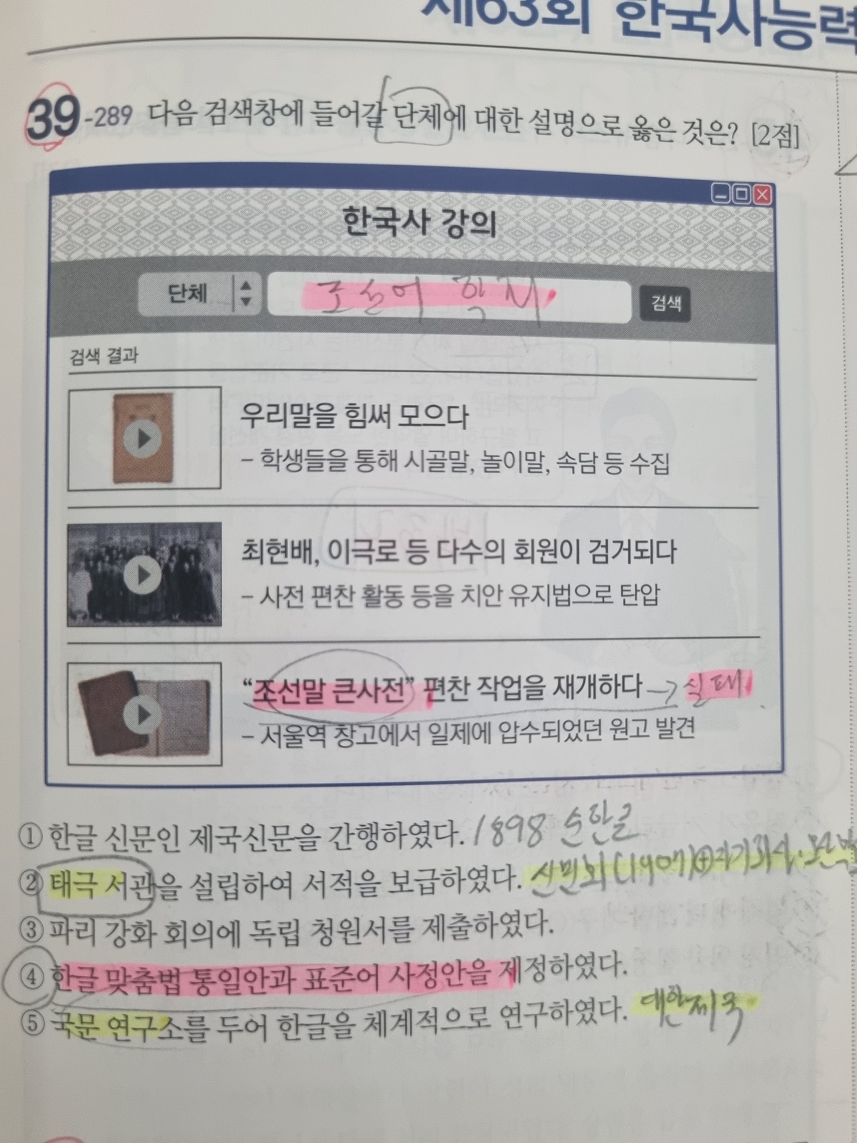 한국사 검정 능력 시험의 특징은 5지 선다형 보기 중에 절대 틀린 문장이 없다는 것입니다. 문제와 연관이 없지만, 다른 시대의 사실이기 때문에 자주 나오는 보기 문장은 기억해 두시는게 좋습니다. 그래서 문제의 핵심 단어와 정답은 같은 형광펜으로, 다른 시대의 빈출 보기 문장은 다른 형광펜으로 표시하여 반복적으로 외워야 합니다. 많은 문제를 푸는 것보다 5회 정도의 기출를 하루에 1회씩 풀고, 같은 문제를 3회독 하는것이 효과적입니다.