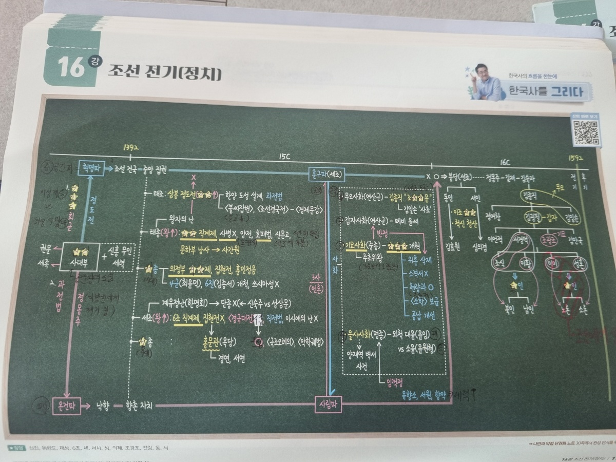 최태성 선생님의 문제집은 단원별로 유튜브 QR코드가 있어 책과 함께 영상으로 공부하는 것이 효율적입니다. 영상을 눈으로만 보면 머리 속에 남는 것이 없기 때문에, 정리된 표에 별표 부분을 적어가면 공부하는 것이 중요 키워드 외우기가 쉽습니다. 한국사 심화는 방대한 양이기 때문에 전체를 빠르게 보고 내가 부족한 부분을 디테일하게 공부하는 것이 좋습니다.