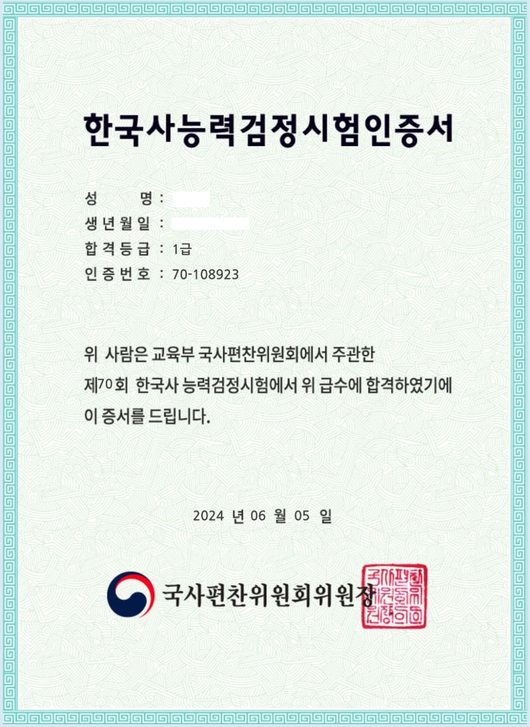 저는 24년 4월 말부터 시험 공부를 시작하여 24년 5월25일 제70회 시험에 응시하여 1급 자격증을 취득하였습니다. 한국사 능력 검정 시험 자격증이 필요하신 분들에게 도움을 드리고자, 제 공부방법을 공유해 봅니다.