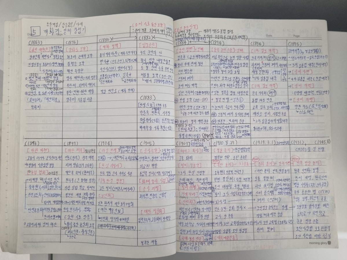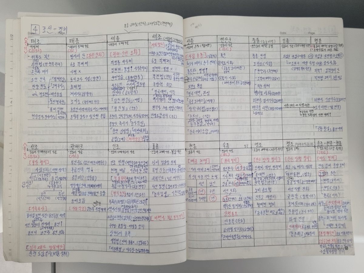 저는 고대부터 현대까지 크게 7단원으로 나눠 1단원을 하나의 그림으로 인식하고 외웠습니다. 예를 들어, "강화도 조약" 이라는 키워드가 어느 페이지 어떤 박스에 들어있었는지만 기억해도, 시대 구분이 가능합니다