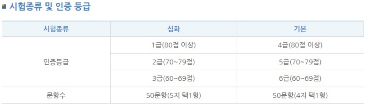 하지만, [심화] 시험은 고등학교 과정에서 배우지 않은 디테일한 내용을 다시 공부하고 기출 유형을 접하지 않으면 난이도가 높은 시험입니다. [심화]시험도 1급부터 3급까지 나누어져 있는데요, 배점은 100점 만점이며 문항병 1점~3점 차등배점하고 있습니다.
