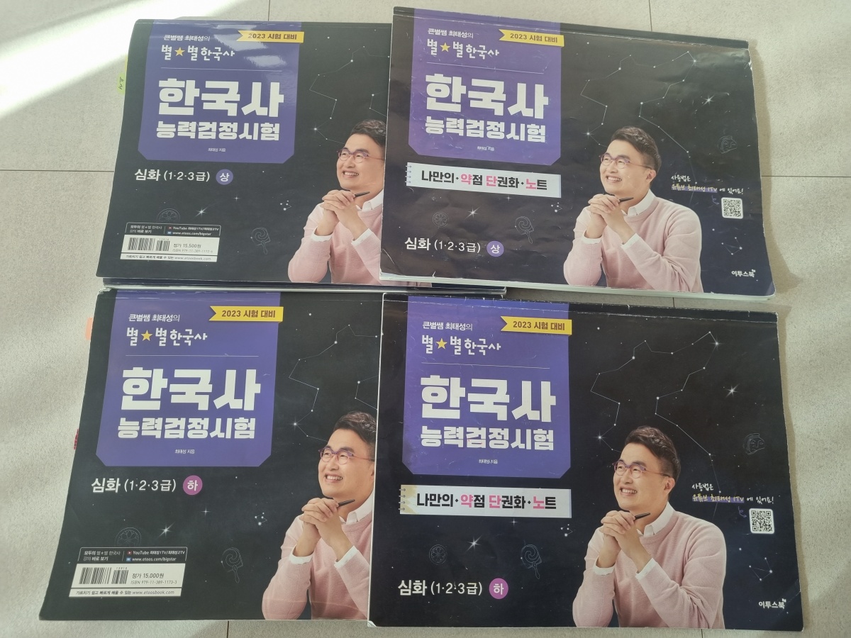 저는 한번 선택한 문제집이 너덜너덜할때까지 다독하는 스타일이라, 처음부터 문제집 종이의 질, 글자체, 글자 색 등을 중요하게 생각하여 항상 서점에 가서 2,3가지 문제집을 꼭 비교 후 문제집을 선택합니다. 최종 후보는 최태성 선생님과 설민석 선생님의 문제집이었는데, 제가 선택한 문제집은 최태성의 별별 한국사 문제집과 회차별 기출 문제집이었습니다. 선택 이유는 개념 정리를 부록으로 간단하게 정리되어 있으며, 이해 안되는 주요 사건들을 서술식으로 설명되어 있어 문제집 한권으로 충분히 모두 이해 할 수 있었습니다. 그리고 실전과 비슷하게 연습하기 위해 시대별 기출문제집보다는 회차별 기출문제집을 선택하였습니다.