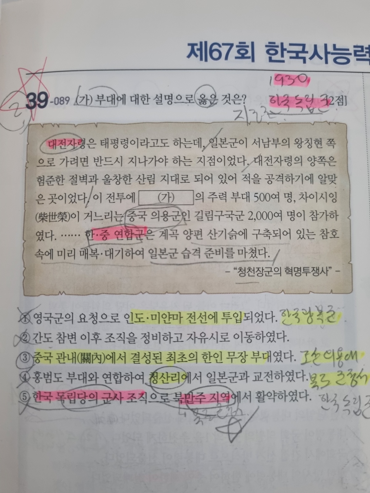 한국사 검정 능력 시험의 특징은 5지 선다형 보기 중에 절대 틀린 문장이 없다는 것입니다. 문제와 연관이 없지만, 다른 시대의 사실이기 때문에 자주 나오는 보기 문장은 기억해 두시는게 좋습니다. 그래서 문제의 핵심 단어와 정답은 같은 형광펜으로, 다른 시대의 빈출 보기 문장은 다른 형광펜으로 표시하여 반복적으로 외워야 합니다. 많은 문제를 푸는 것보다 5회 정도의 기출를 하루에 1회씩 풀고, 같은 문제를 3회독 하는것이 효과적입니다.